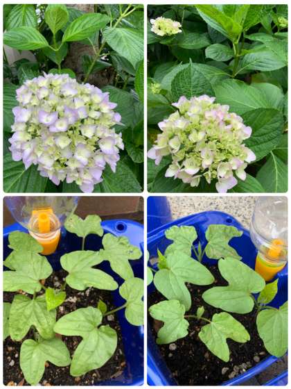 あじさいが咲き始め、1年生が植えたあさがおの双葉が開き、本葉が出はじめました。
