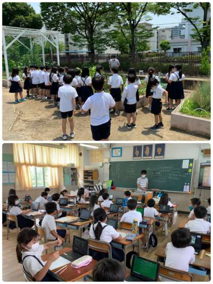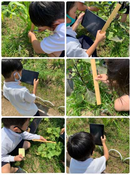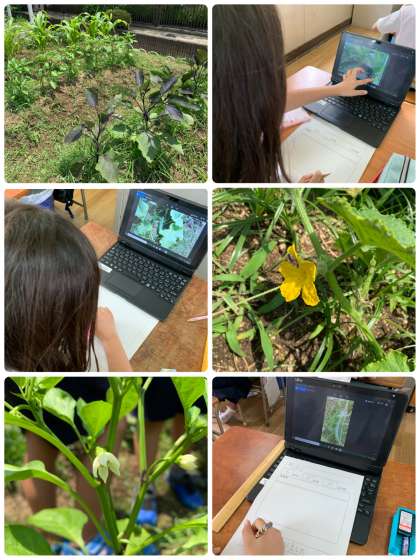 教室に戻り、自分で撮った写真や測った長さの記録を見ながら、前に観察した時のとのちがいを見つけていました。大きく実ったきゅうりに驚いていました。