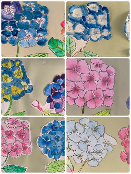 5年生は、「あじさいの花」を描きました。色交ぜを工夫し、花びらを丁寧にぬりました。