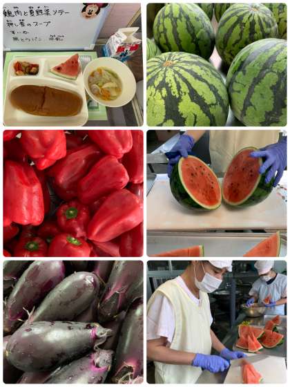 給食室には、大きなすいか、色とりどりの夏野菜が届いていました。