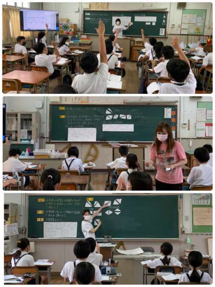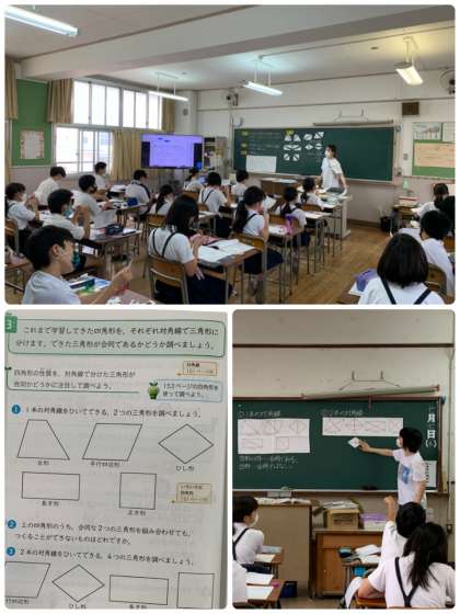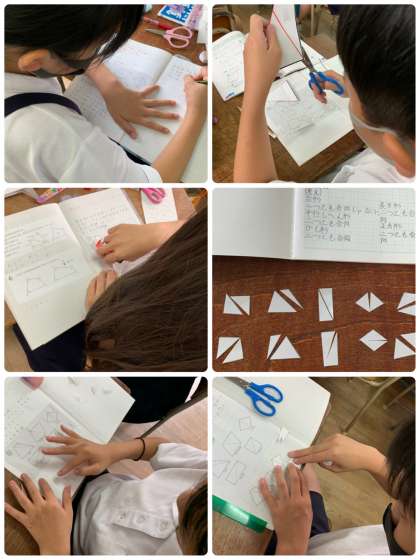 算数科「いろいろな四角形の性質」について学習しました。対角線で分けた三角形が合同かどうかに注目して調べました。対角線を引いたり、実際に切ったりしていました。