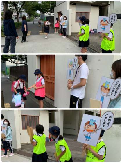 児童会の運営・計画委員のみんなが南門の前に立ち、登校してくるみなさんに「おはようございます!」と元気いっぱいに呼びかけていました。