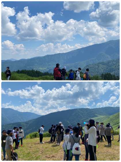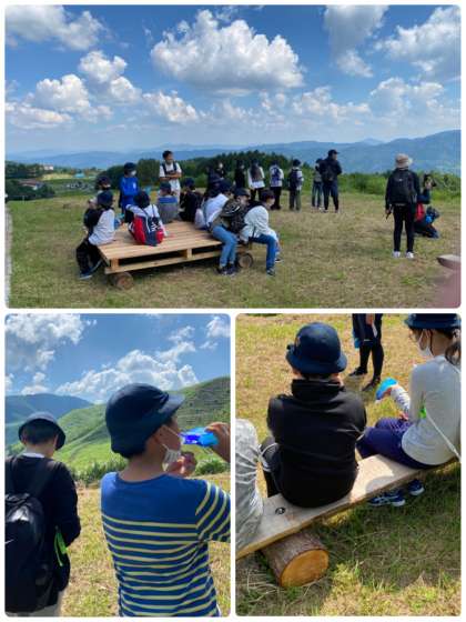 途中で休憩しながら、友だちと力を合わせて山頂をめざしています。