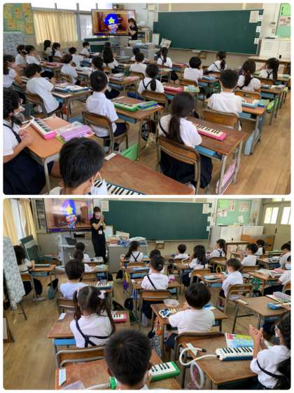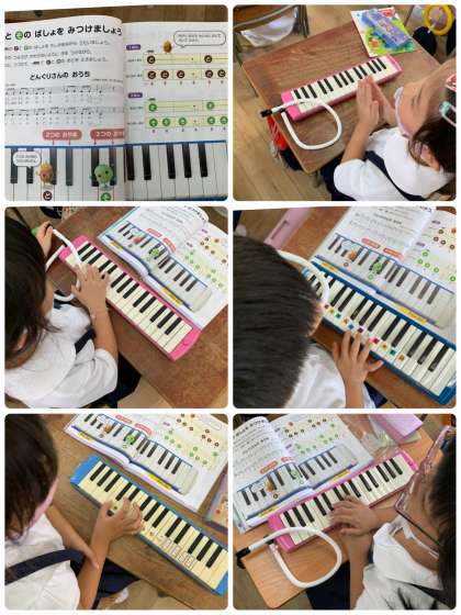 けんばんハーモニカをふく子と、リズム打ちをする子に分かれています。