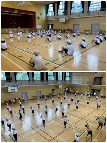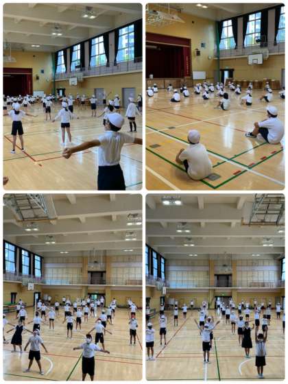 今日は、ラジオ体操をしました。伸ばすところや曲げるところに気をつけて体操をしました。