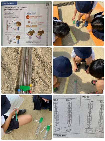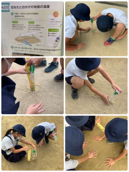 グループで協力して観察し、温度計のめもりを見たり、地面を手で触ったりして、温度のちがいに驚いていました。