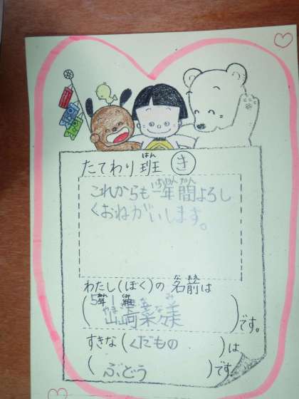 同じ班になった一人一人とジャンケンをした後に、持ってきたカードを「どうぞ よろしく」と渡して回っていました。カードには、自分の名前とともに、メーッセージと好きな「もの」「こと」などが書いてありました。