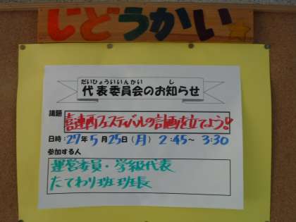 喜連西フェスティバルまで、あと1か月を切りました。今日の代表委員会で、喜連西フェスティバルの計画を立てていくというお知らせがありました。