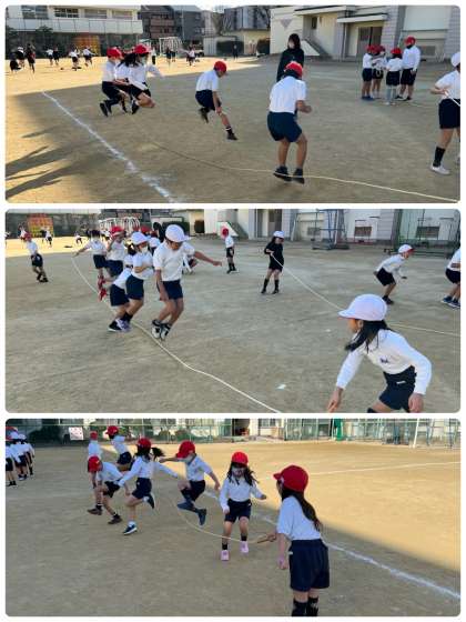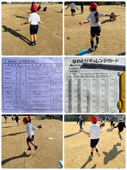 2年生は、なわとびチャレンジカードを持ちながら、回数にチャレンジしたり、グループで何回跳べるかにチャレンジしたりしました。