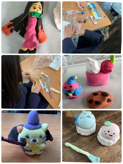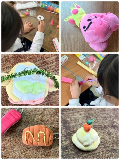 紙粘土に絵の具をまぜて、かわいいマスコットを作っていました。