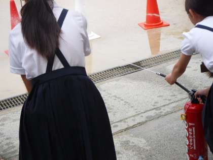 5・6年生は、避難した後、水消火器で消火をする体験をしました。