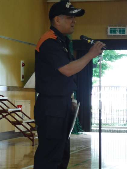 消防署の方は、出火時の有害な煙を吸わないように、低い姿勢で避難することの重要性を語ってくださいました。そして、「おさない」こと、「はらない」こと、「もどらない」こと、「勝手な行動をとらない」ことを約束してほしいと、子ども達に伝えておられました。