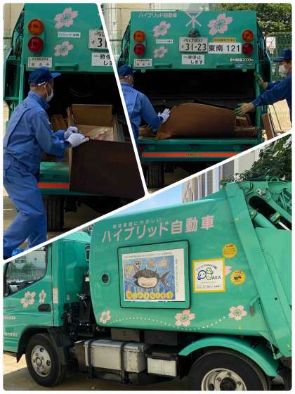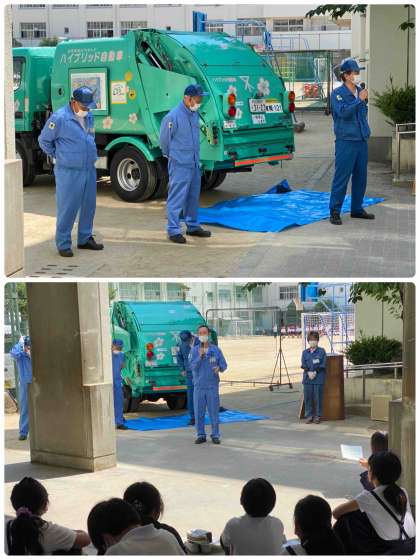 パッカー車が校庭に登場し、実際に操作をして大型のごみをつぶす様子などを見学しました。また、ごみの減量をするためにどのようなことができるのかを考えました。クイズを交えながら楽しく学習することができました。