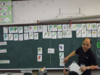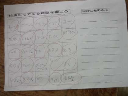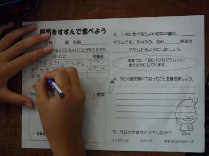 今日は「野菜」についてです。給食に登場する野菜を思いつく限り書いたり、野菜のはたらき(1.目や肌の調子を整える 2.風邪などの病気を予防する 3.便秘を防ぐ)について考えたり、1日に必要とされる野菜の量を教えていただいたりしました。