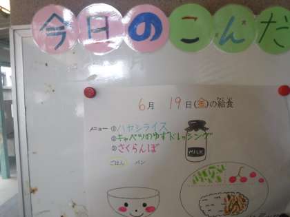 いつも子ども達が安全に食べることができるように子ども達が食べる前に、職員で検食をしています。今日はハヤシライスに、キャベツのゆずドレッシング、さくらんぼもあります。子ども達も喜んで食べそうなメニューです。
