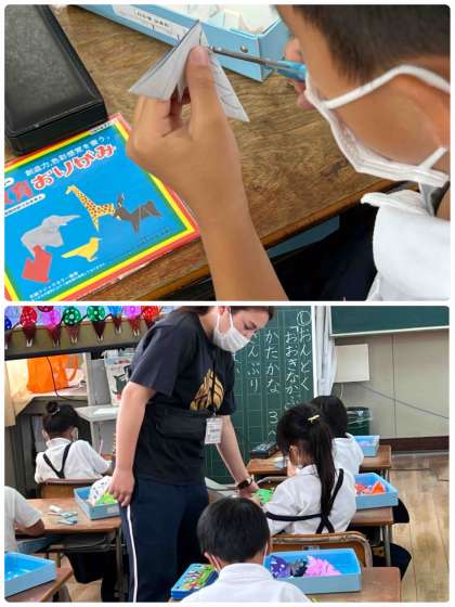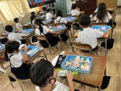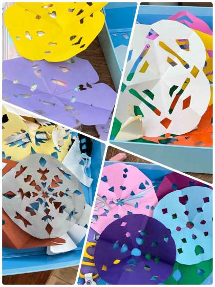 子どもたちは、三角や丸など、いろいろな形で切って、きれいなかざりを作っていました。