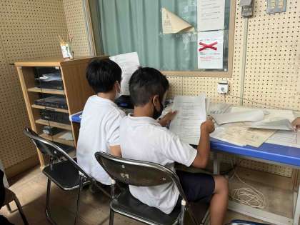 たてわり班の教室で、放送で流れてくるストーリーの間違いについて考えました。