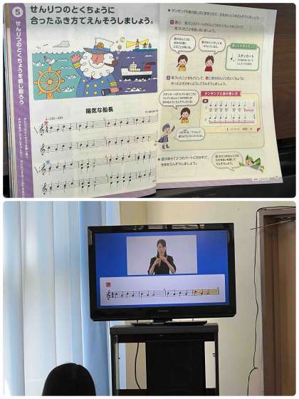 子どもたちは、タンギングや息の使い方を意識しながら、工夫した拭き方で練習していました。船長の陽気な様子を表現することができましたか。
