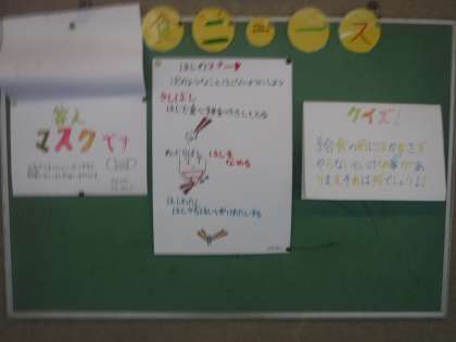 給食委員会から問題が出されています。ヒントは、食中毒の予防のためにすることです。懇談会やお迎えの際に、ぜひお子様と一緒に答えを確かめてみてください。