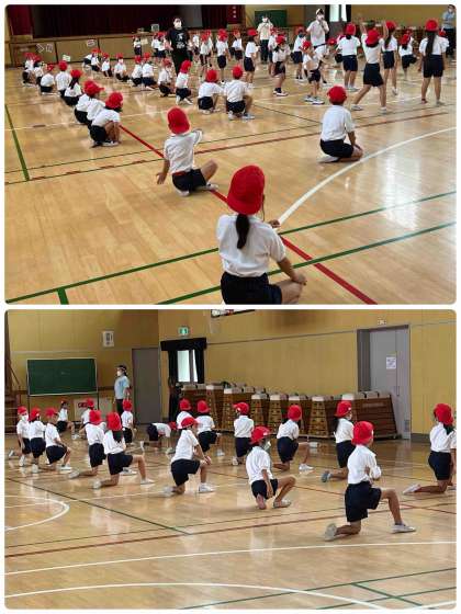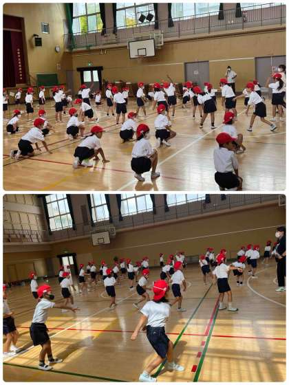 運動会に向けて団体演技の練習を頑張っている1年生。