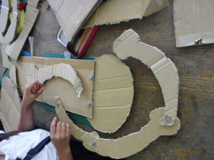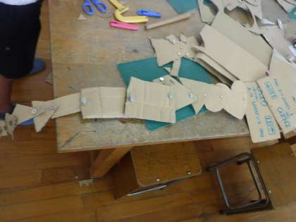 先週の続きです。前回は、段ボールをいろんな形に切ることに夢中になってしまった感があったので、今日は創作活動に入る前に、「今日は、どんどんつないでいくんだよ!」と話して始めました。