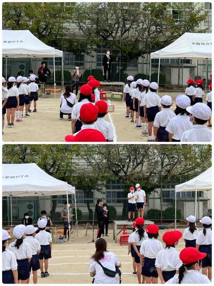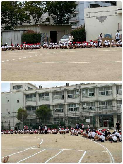 天候が少し心配でしたが、無事に1時間目をつかって、運動会の全体練習を行いました。
