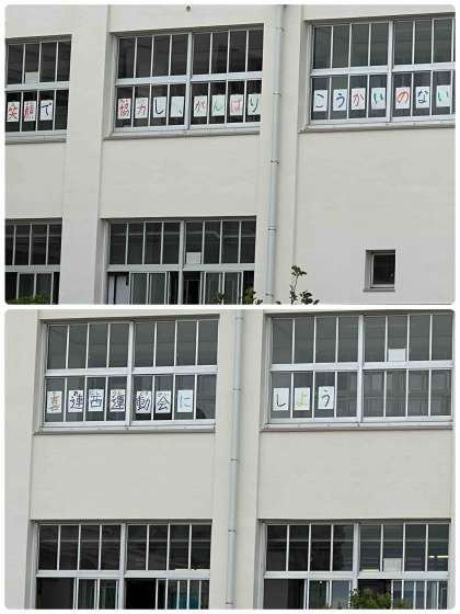 また、校舎の3階窓には、子どもたちが考えためあてが書かれています。みんなで達成できるように、頑張っていきます!