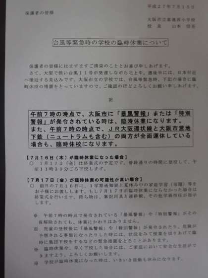 さて、台風が近づいております。本日、写真のようなお手紙をお子様を通じてお渡しします。17日の終業式に影響があると判断し、16日に通知表・夏休みの宿題等をお渡しすることにさせていただきますので、ご了承ください。