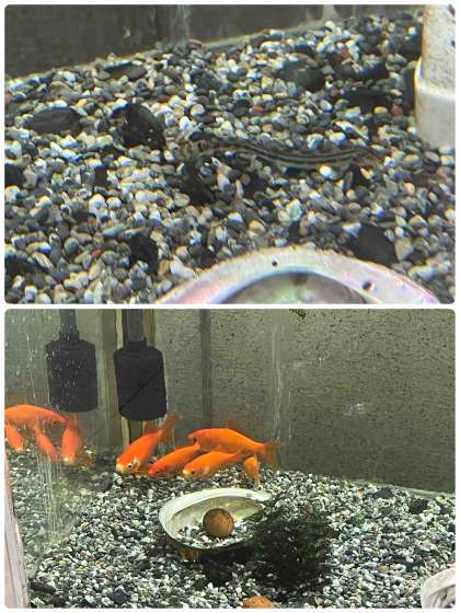 玄関の水そうで、金魚・めだか・どうじょうを飼っています。