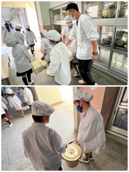 給食当番の様子です。子どもたちは、挨拶をして給食室に入り、落とさないように気を付けながら頑張って運んでいます。