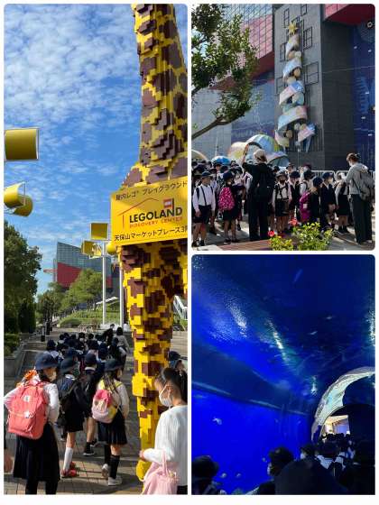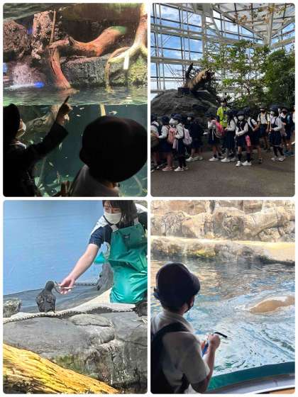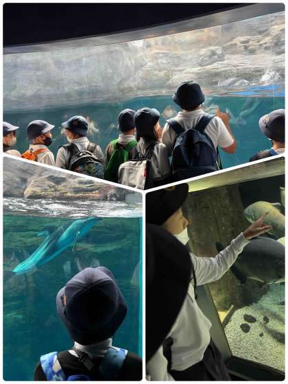海遊館の中では、有名なジンベイザメをはじめ、ペンギンやアシカ、アザラシなど、いろいろな生き物がいて、子どもたちは興味深々に観察していました。