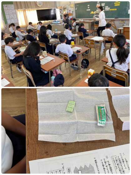 などについて学習しました。噛む回数や唾液の量によって色が変わるガムを噛んで、咀嚼能力を調べました。また、生活習慣を確認した後、フッ化物洗口をしました。歯を大切にすることだけではなく、歯みがきのポイントや、普段の生活習慣など、いろいろな角度で学習することができました。