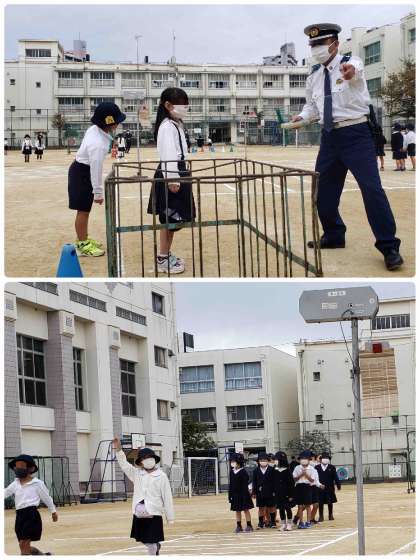 運動場を使って、横断歩道のわたり方や信号機の意味等について学習しました。