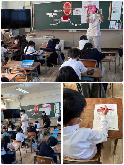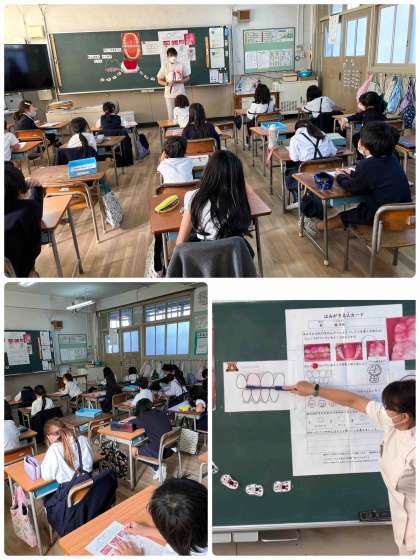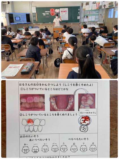 など、色々なことを学びました。また、DVDの教材を使って、実際に歯みがきの仕方も学びました。特に、みがく場所によって歯ブラシの持ち方を変えると、みがきやすいということがわかり、子どもたちも真剣に取り組んでいました。