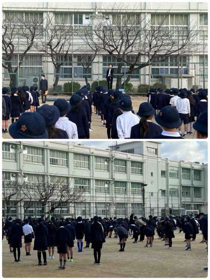 3学期の始業式は、運動場で行いました。風が冷たい中でしたが、しっかりとお話を聞きながら、参加することができました。