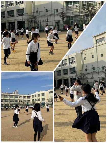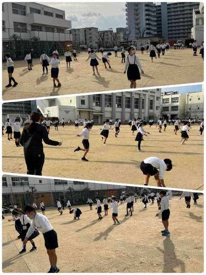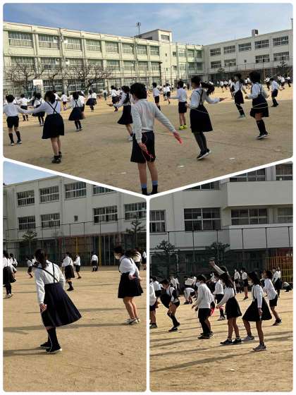 Adoの曲にのせて、いろいろな跳び方でなわとびをします。今日は高学年(6年生は社会見学で不在)でしたので、あや跳び・交差跳び・後ろかけあし跳びなど、高度な技にも挑戦しました。