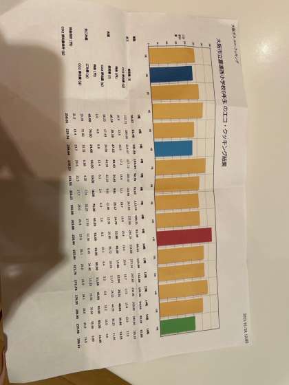 各班のガス・水道・生ごみ量の使用量やCO2排出量、料金などが計算され、グラフとして表されました。