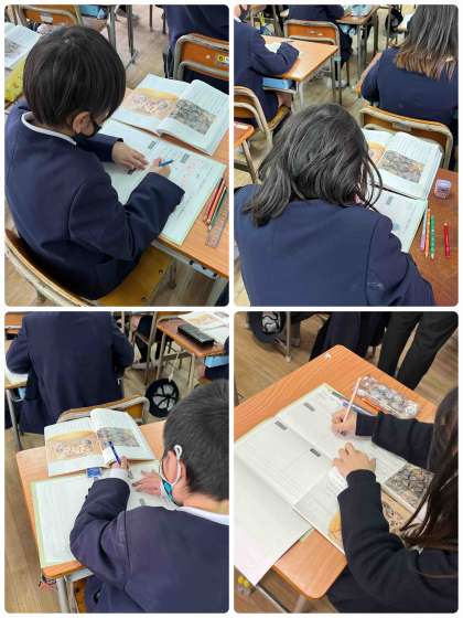 今日の授業では、セネガルの家の説明を読み、そこから「土地のとくちょう」「人々のくらし」「家のざいりょう」「家のつくり」の4つに分けて考えました。