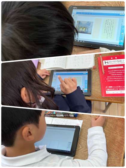 一人一台端末を使って、国語の学習をしました。それぞれが調べた動物の知恵について、発表ノートという機能を使ってまとめていました。