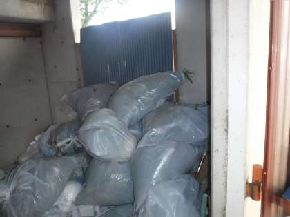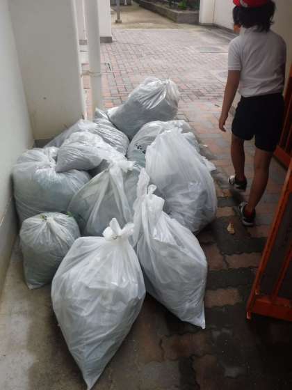 全校の力を合わせて抜いた雑草を入れた白いビニル袋がたくさんできました。