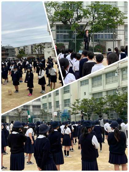 今日の朝会では、1年生が今年度初めて一緒に参加しました。