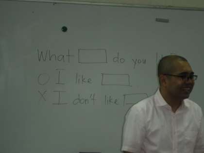 この時間は、5年生が「What □ do you like?」と質問して、「I like □./I don't like□ .」と答える練習を、音楽とボールを使ったゲームを通してしていました。
