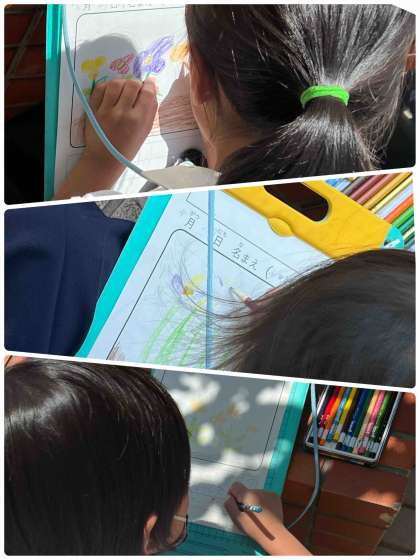パンジーやビオラなどのきれいな花を見つけて、色鉛筆で絵を描きました。