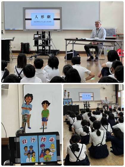 人形劇を使いながら、テーマである「万引き」について考えました。万引きは、実際に自分がやってなくても見張りをすることでも犯罪になることや、誘われた時にしっかりと断ることができるように勇気をもつことなど、子どもたちの目線でのお話がたくさんありました。