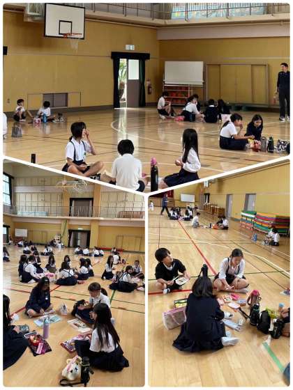 給食時間は、それぞれが持ってきたお弁当を、学年で広げて食べました。朝早くからご用意いただき、ありがとうございました。