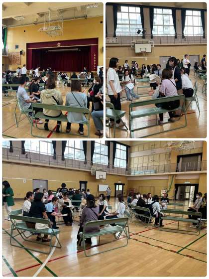 放課後に体育館で、「PTA予算総会・所属を決める会・全委員会」がありました。