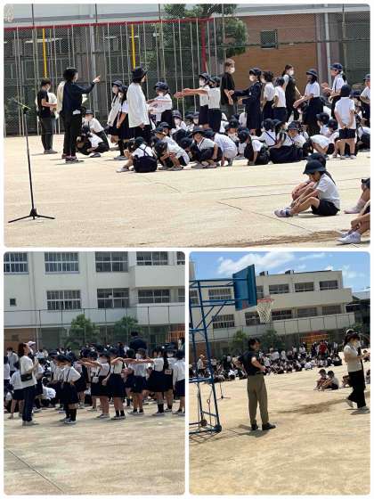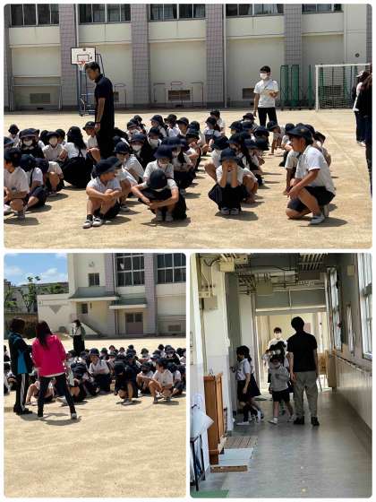 地震が起こった想定で、教室内で安全確保、運動場への移動をしました。