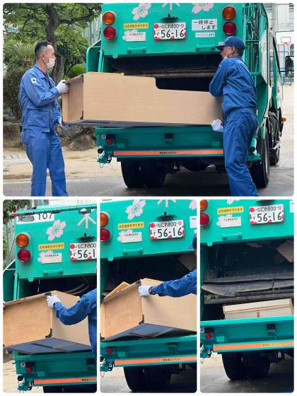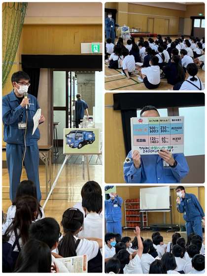 実際に使っているパッカー車が来て、近くで粗大ごみをつぶしながら実演してもらいました。また、パッカー車の種類や値段、ごみの種類など、様々な角度で学ぶことができました。