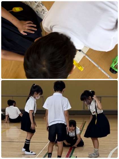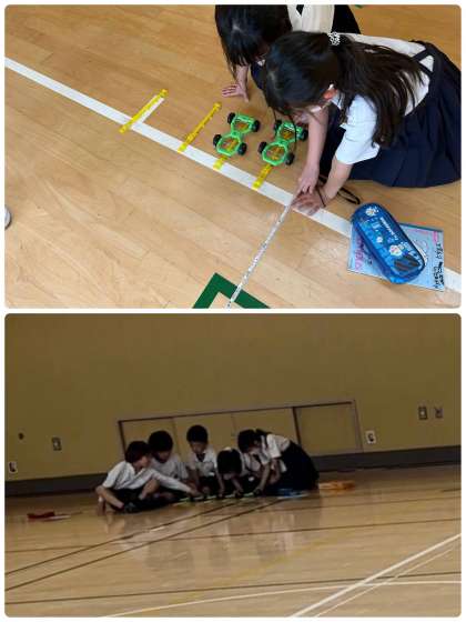 講堂を使って、輪ゴムを伸ばす長さを変えながら、ゴムの働きを調べました。