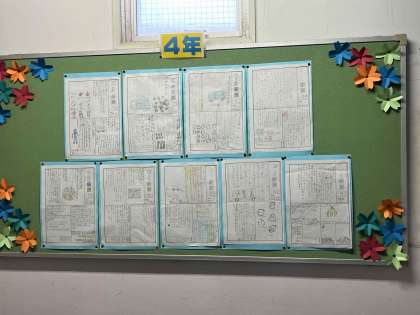 先日、出前授業(パッカー車)で学んだことを新聞にまとめて、階段のところに掲示しています。